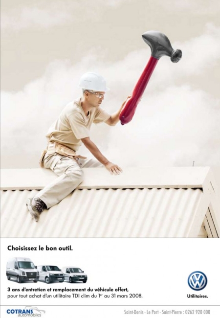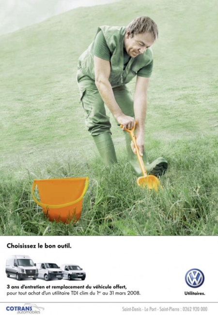 Johan J. of Stimulansbloggen sent in these VW ads for their “utility” line, which depict the vehicles as “tools” to be used in manual labor (the tagline below each one says “Choose the right tool”):