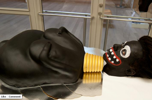 April 15th was World Art Day. A museum in Stockholm, the Moderna Museet, celebrated with what appears to be a chocolate and red velvet cake in the likeness of a caricature of member of a generic African tribe. The cake was designed by an artist, Makode Aj Linde, who wanted to draw attention to the practice of female genital cutting, which occurs in parts of Africa (and elsewhere). Accordingly, the cake was in the shape of a woman’s shoulders, breasts, belly, and genitals; it was covered in black fondant. The head was the artist himself, painted black with cartoon-ish eyes and mouth reminiscent of American minstrelsy. Neck coils tied it all together.
