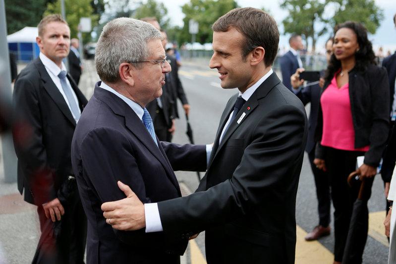 IOC President Bach welcomes French President Macron, who is also the head of the Paris 2024 candidate city delegation, at the Olympic Museum in Lausanne