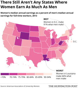 The wage gap varies from state to state, with women in Louisiana, Utah and Wyoming experiencing the widest gap (65, 67 and 69% respectively, in relation to men’s wages), and women in D.C., New York and Hawai’i experiencing a smaller gap (90, 87, 86 respectively, in relation to men’s wages). The gap between women’s and men’s wages has narrowed since the 1970s, due largely to women’s progress in education and workforce participation and to men’s wages rising at a slower rate.