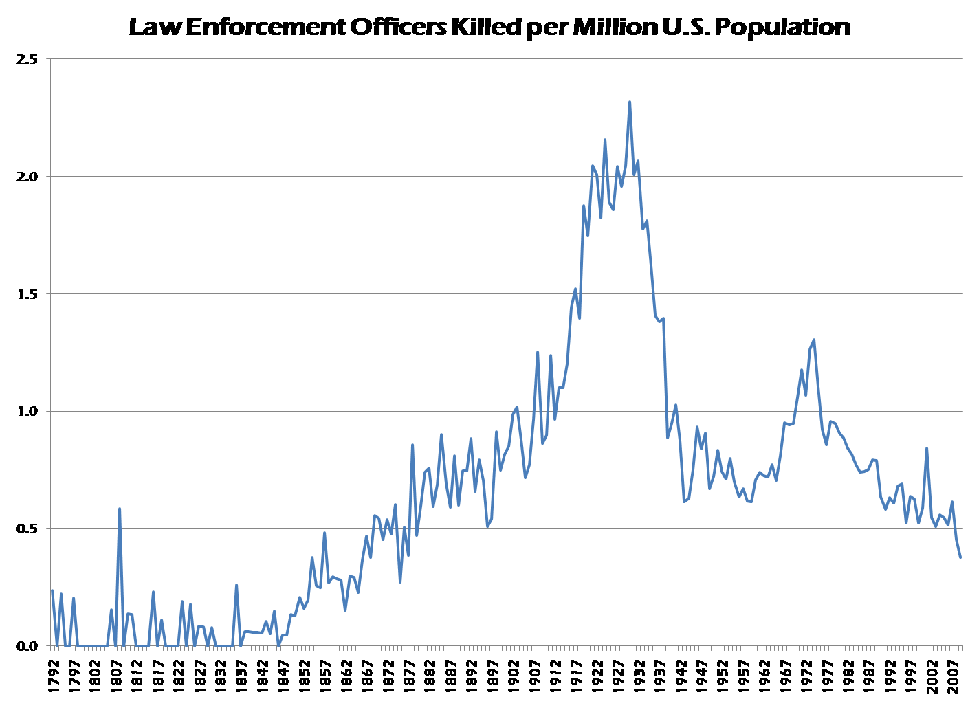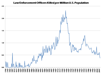 A few caveats on this analysis: I cannot vouch for the quality of the National Law Enforcement Memorial Fund data in the early years of this series, but it seems to track the FBI data very closely for more recent years. One might also critique the latter figure for using the total population as the denominator rather than the number of law enforcement officers.