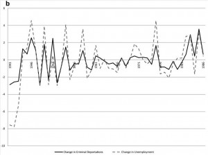 Some influential social theories predict a strong link between criminal punishment and unemployment rates, but the research usually paints a more complicated picture. The picture above, taken from a new article with Ryan King and Mike Massoglia, doesn’t seem so complicated by comparison. I won’t belabor all the details, but one basic idea was to ask whether the United States deported more people for criminal … Continue reading Unemployment and Deportation
