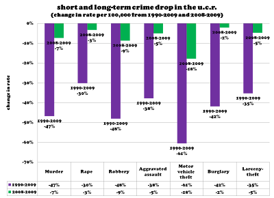 But crime is dropping across each of these categories. The purple bars show the magnitude of the drop in the past 20 years, comparing 1990 rates with 2009 rates, or ((2009-1990)/1990). The green bars show the most recent change from 2008 to 2009 ((2009-2008)/2008). I’d normally compare these numbers with those from the National Crime Victimization Survey before drawing any big conclusions about crime trends. With regard to the FBI’s official crime index, however, it seems pretty clear that there has been a significant drop in crime reported to police over the past year and, for that matter, over the past twenty years.