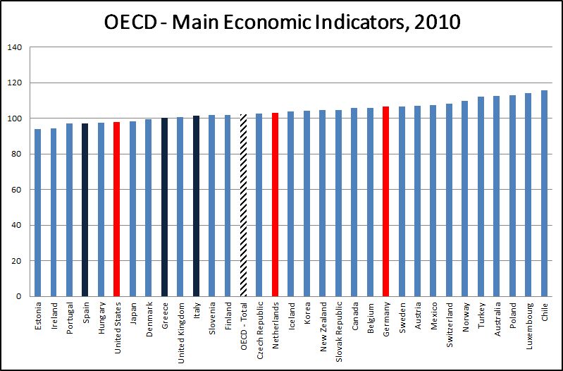 I wasn’t surprised that the US anchored the low end of the scale. Workers here have less job-protection than those in any of the other countries. And Greece and Spain are above the average. But so are Germany and the Netherlands, though only slightly, while Italy is slightly below the average. There’s really not much difference between these three. And if you look at the array of countries, there seems to be no strong connection between job protection and how well the country is weathering the current long recession. I’m not sure what the best measure of the overall economy is, but the OECD has composite figure made up from ten main economic indicators.*