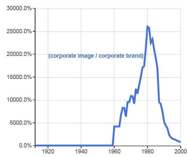 Then, sometime around 1980, image began to fade. In its place we now have brand. I went to Google N-grams and looked at the ratio of image to brand in both the corporate and the political realm. The pattern is nearly identical.