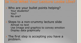 Who is your powerpoint presentation created for? That is, who benefits most from what you put on the slides? Do you put everything a student would need to know to do well on exams? Probably not. When you know a topic like the back of your hand do you put a whole lot of fine … Continue reading Death By Bullet Point: How To Teach With PowerPoint